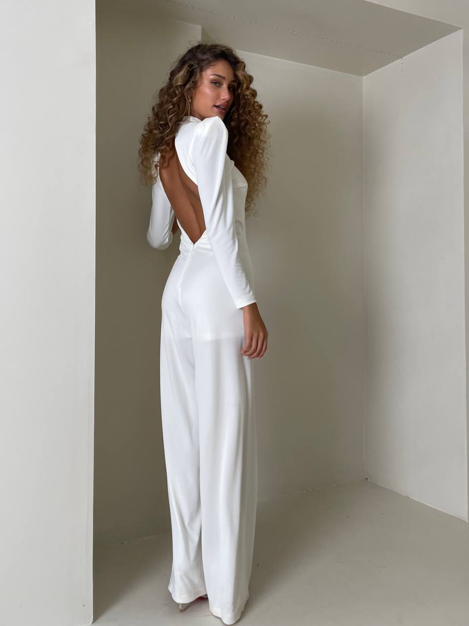 אוברול עם כתפיים מודגשות, מחשוף עמוק בגב, ומחשוף עדין בקדימה, מכנס בגזרה רחבה, למראה ערב קלאסי.