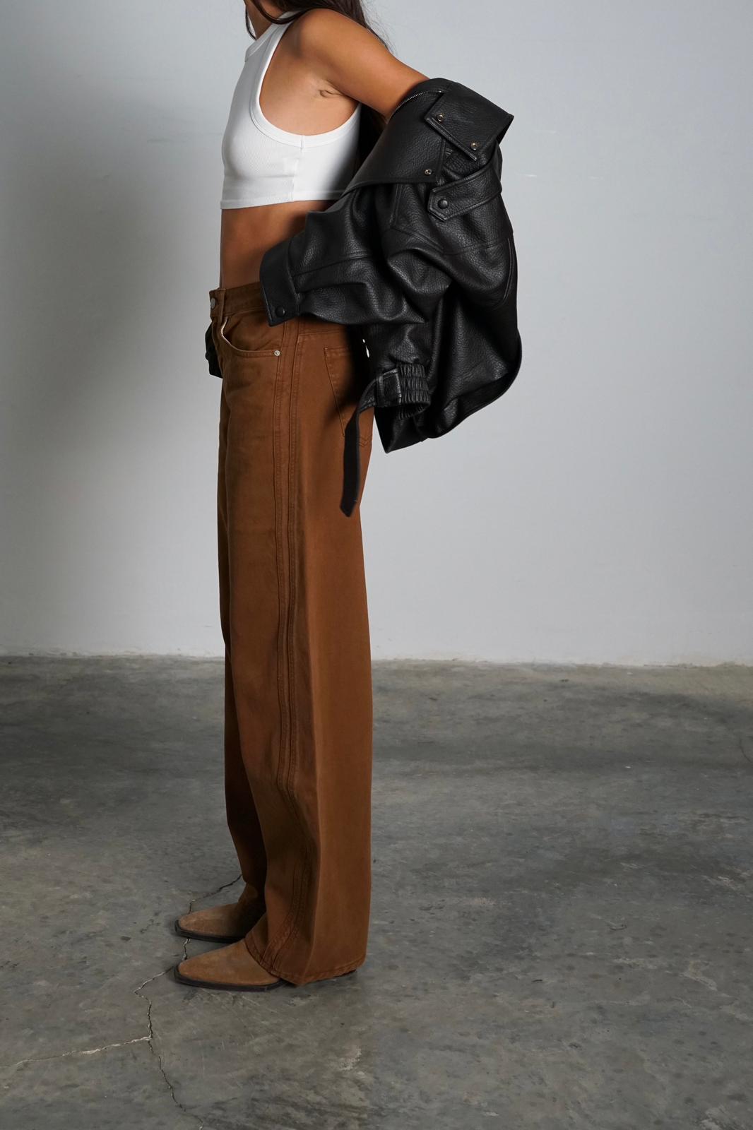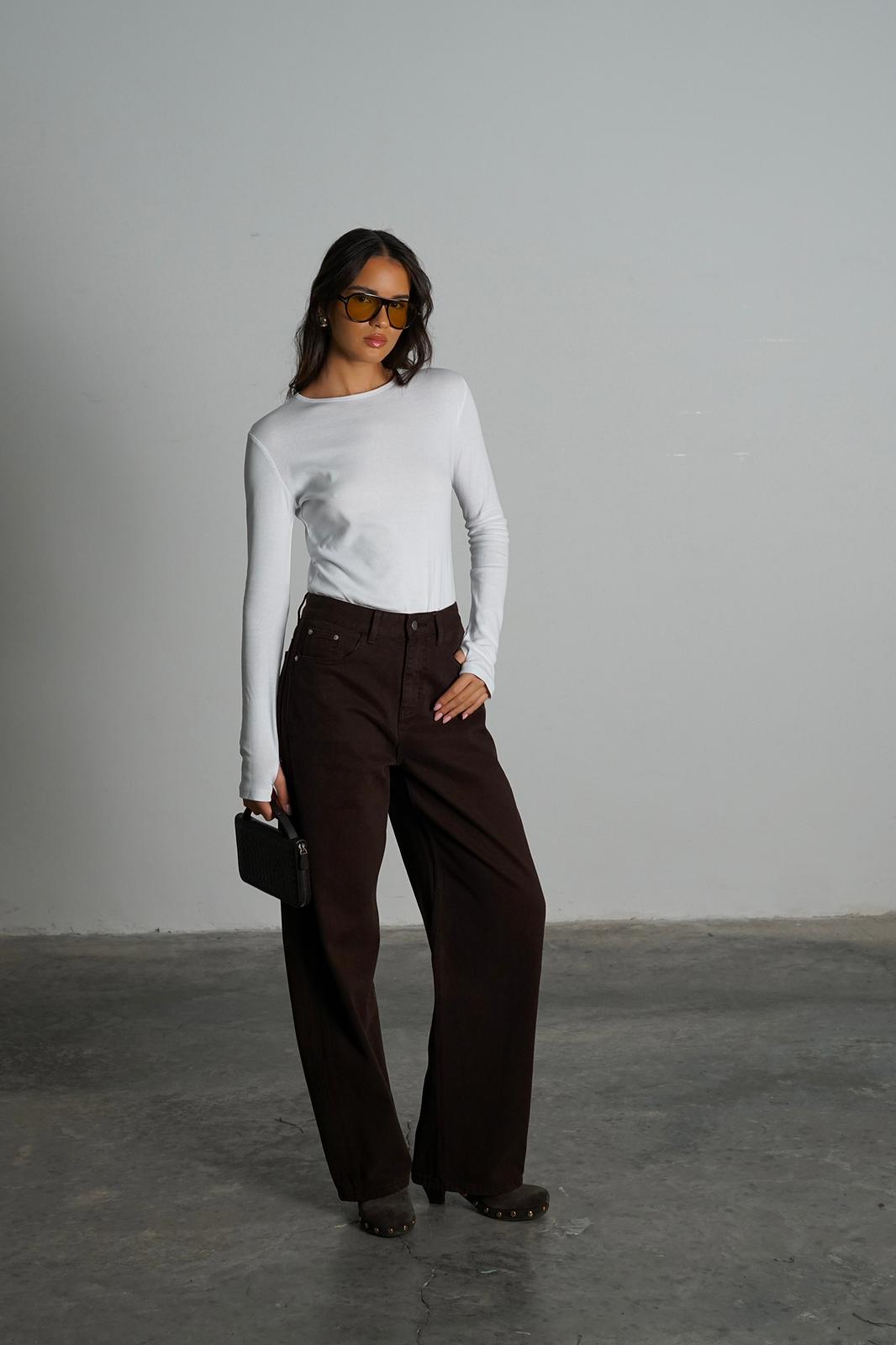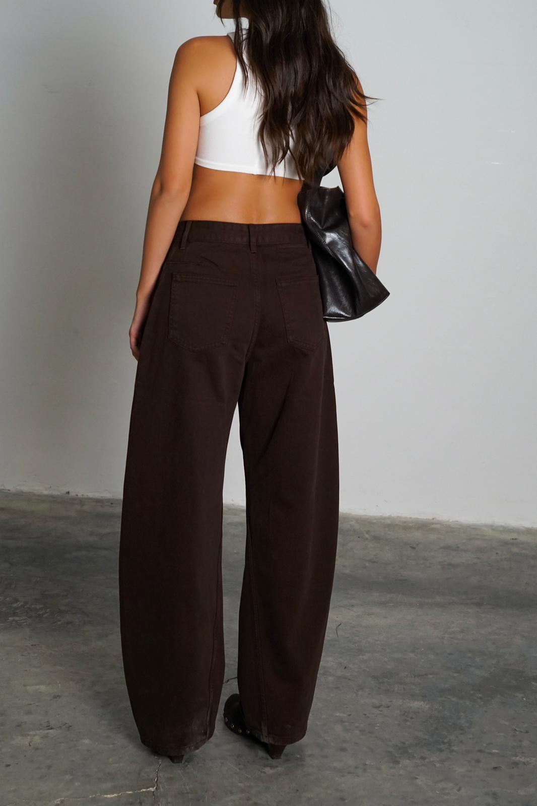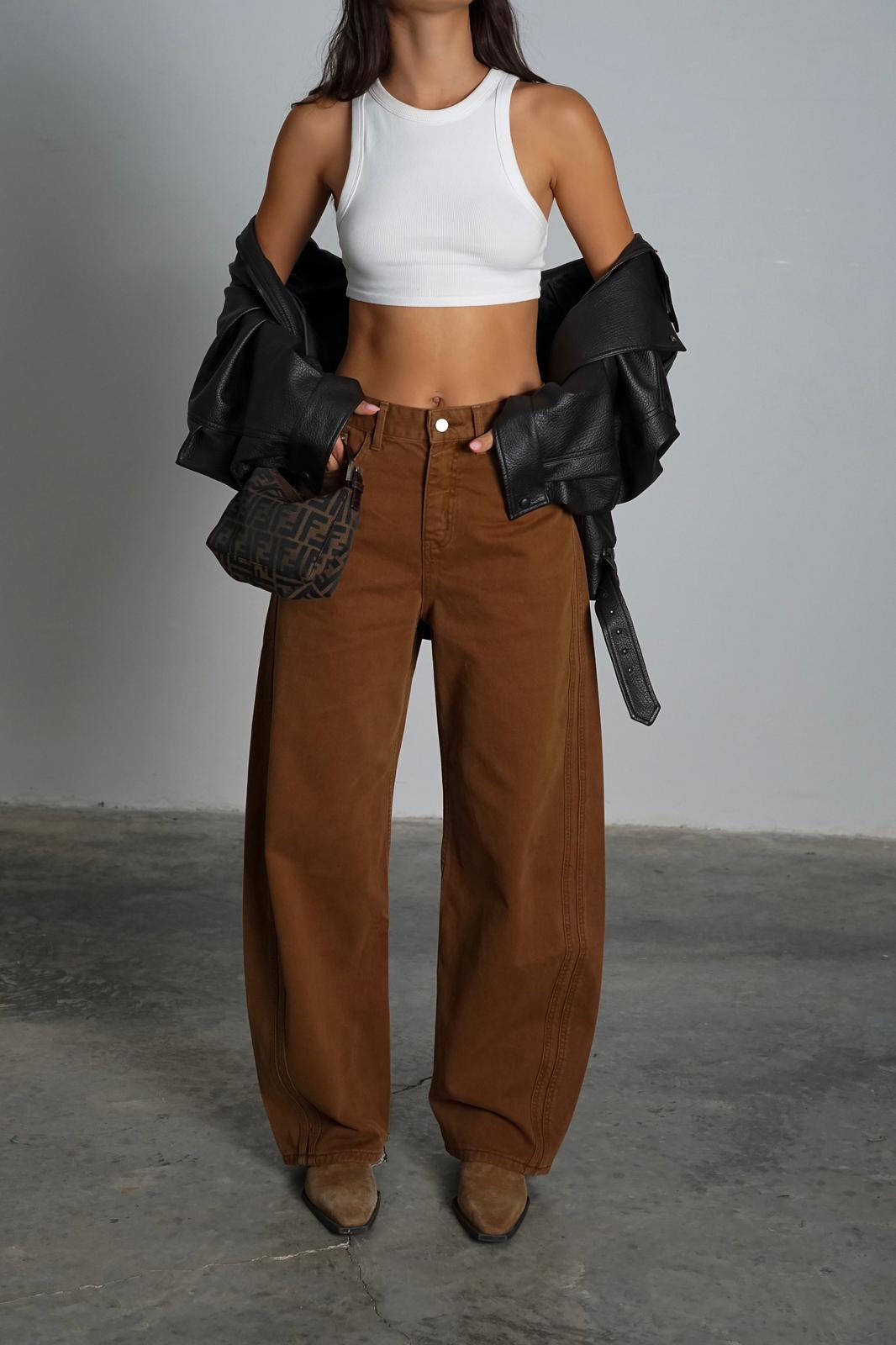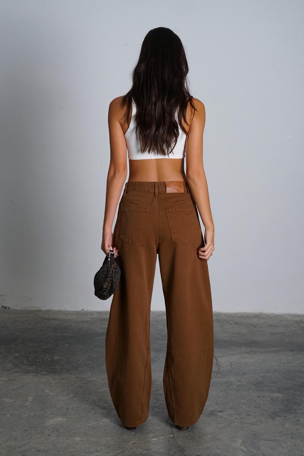 מכנסי בד ג'ינס בגזרה גובהה ורחבה במבנה מעוגל