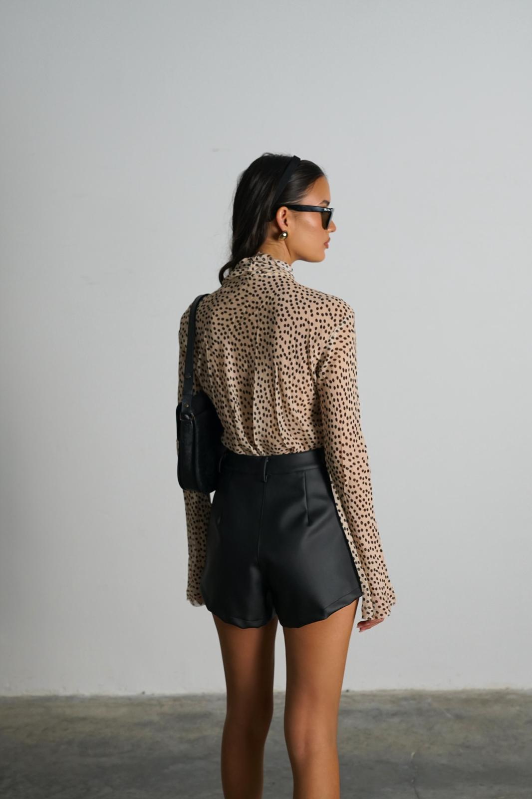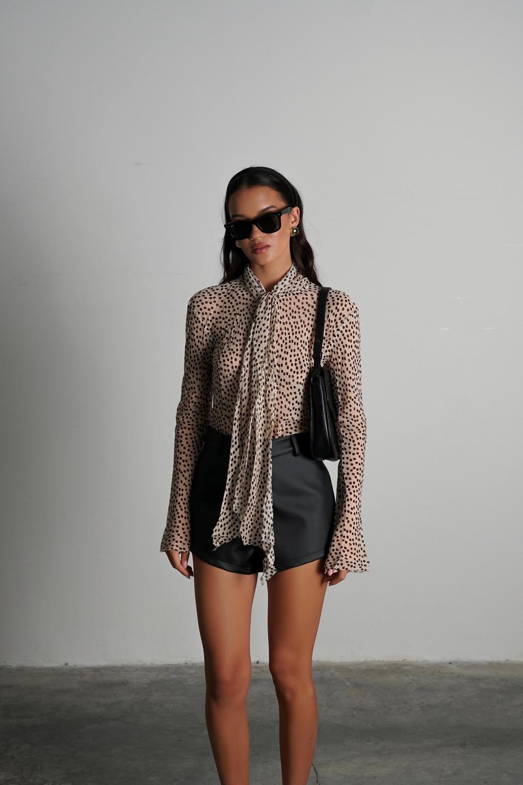 חולצה מכופתרת בד שיפון הדפס נקודות שחורות עם צאוורון קשירה