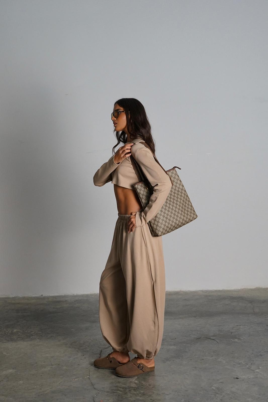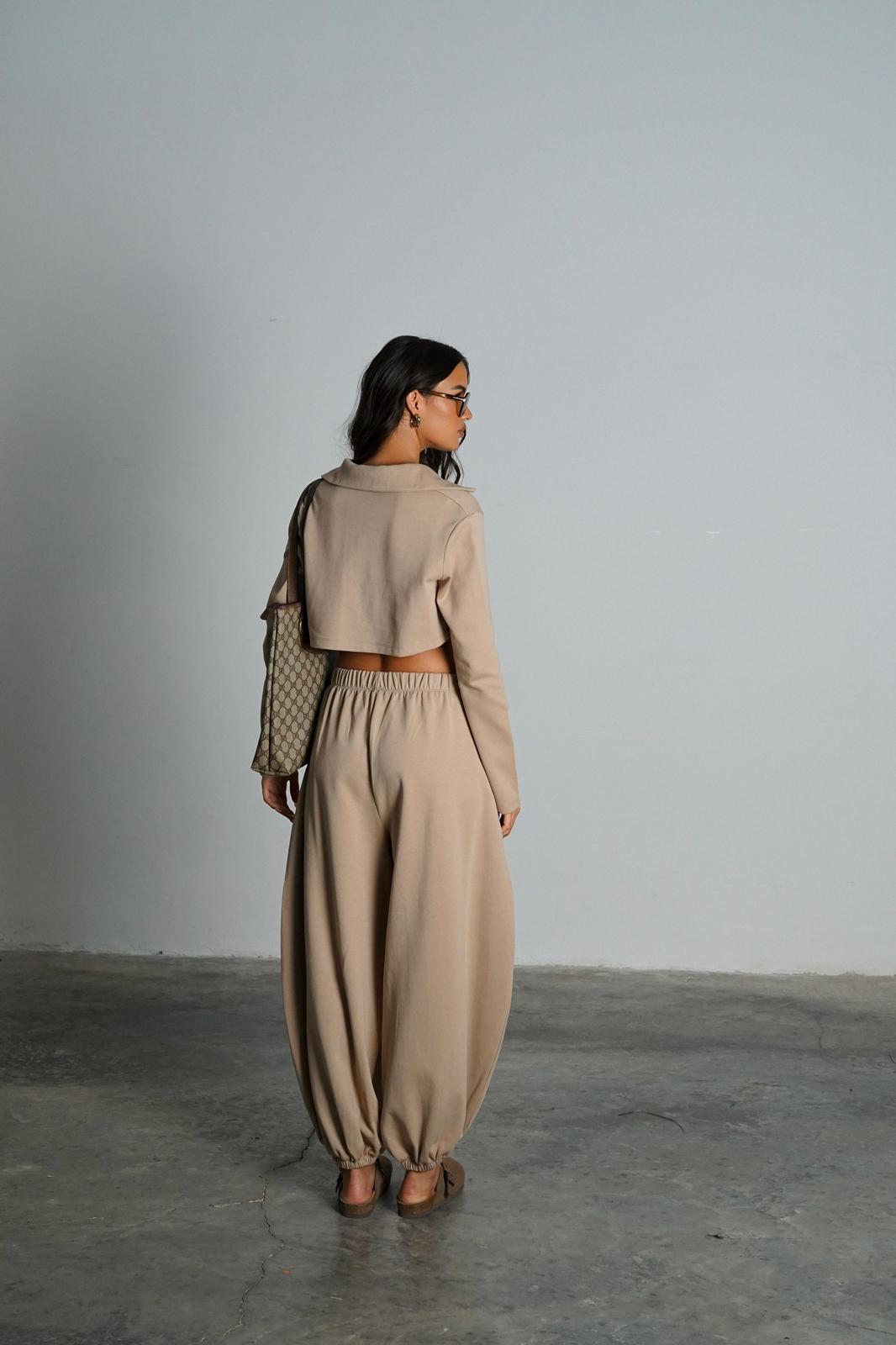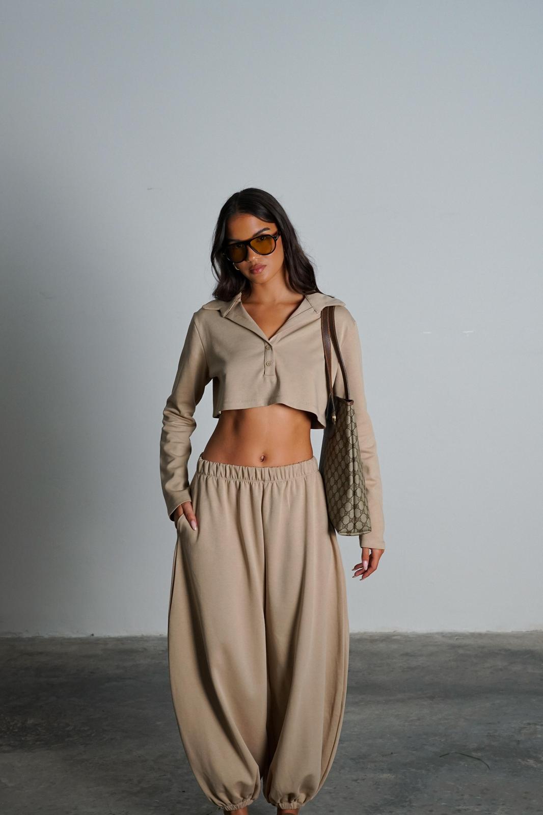 חולצת קרופ צווארון פולו שרוול ארוך | מכנסיים בגזרת בלון עם גומי במותן ובאזור הקרסוליים.