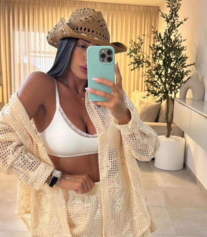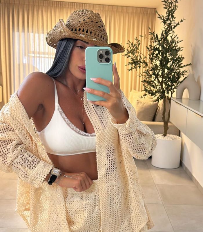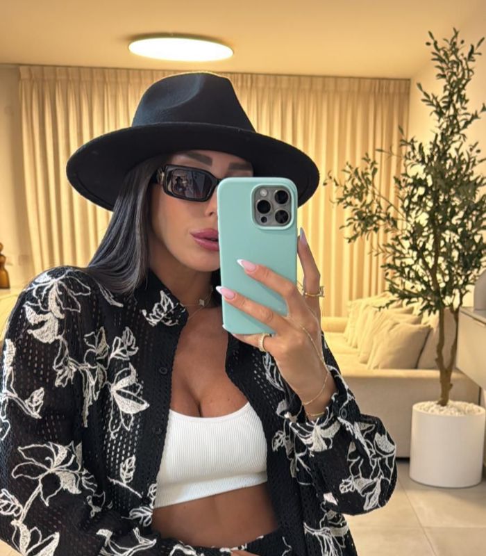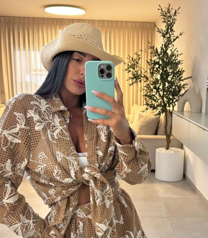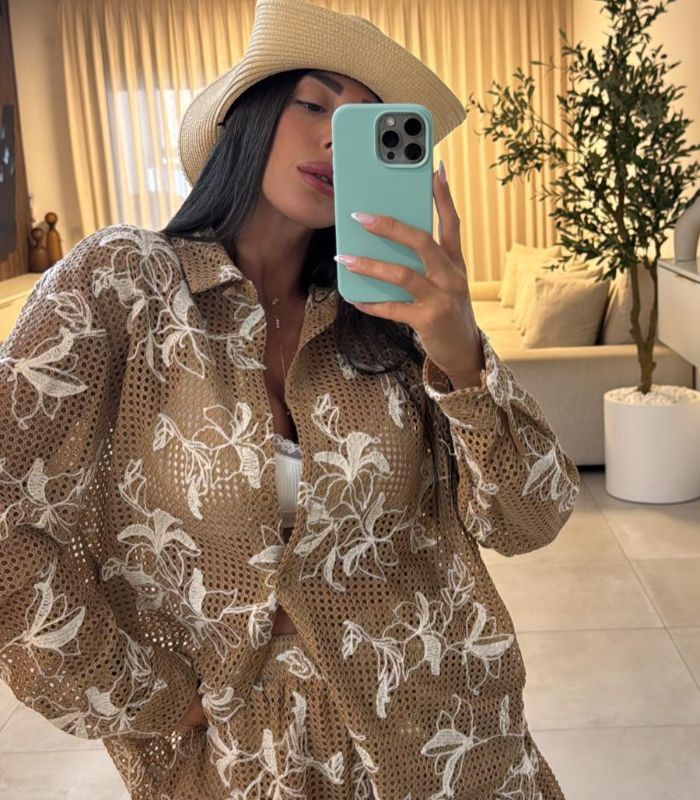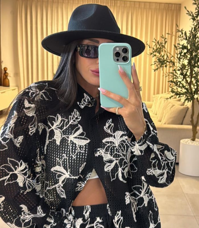 חליפת תחרה פרחים – סט מושלם בגזרת אוברסייז קלילה, עשוי בד רשת עם דוגמת תחרה ופרחים. הסט כולל חולצה מכופתרת ומכנסיים קצרים תואמים.