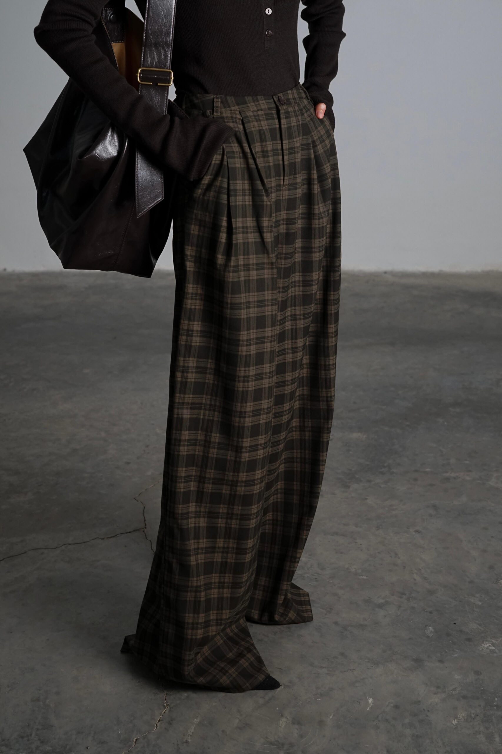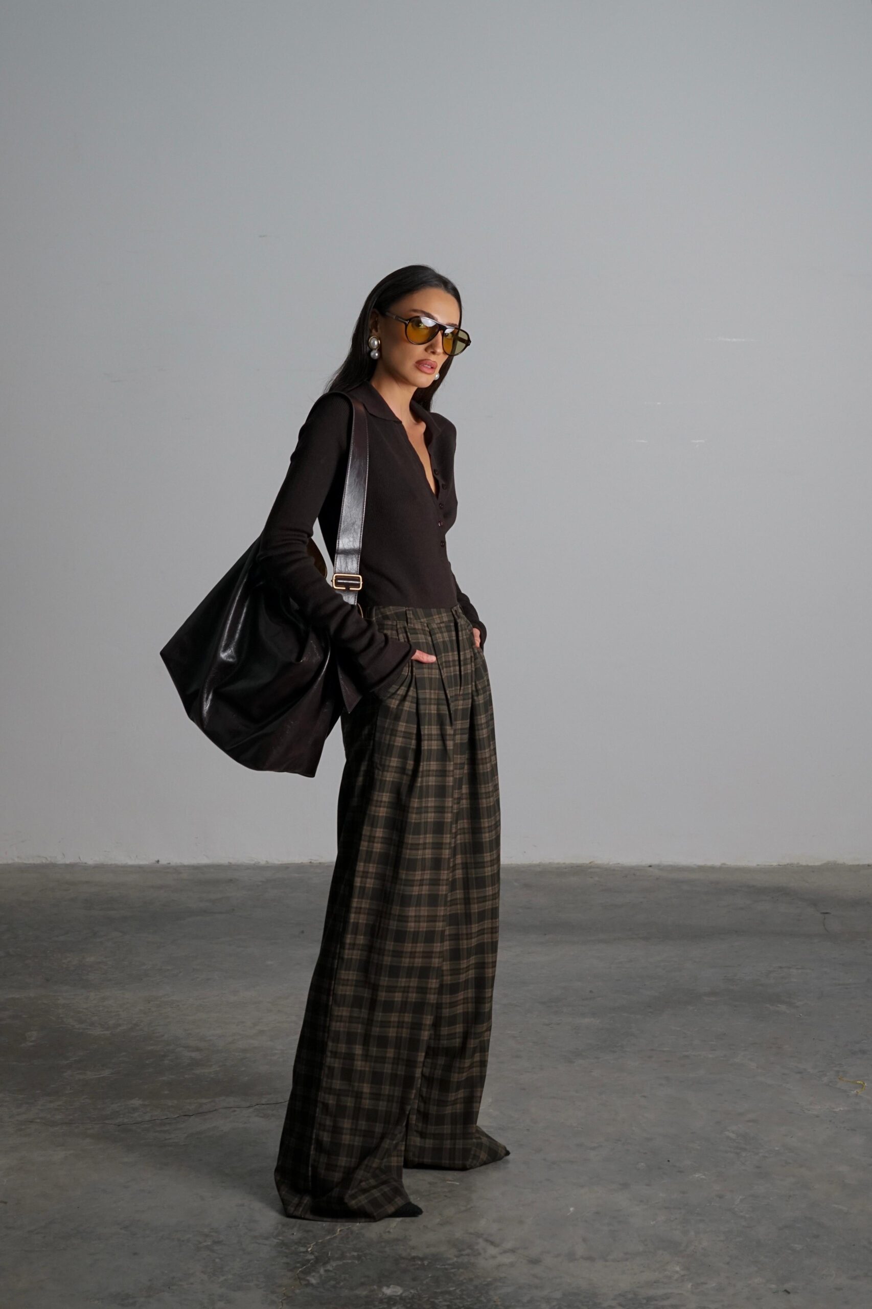 מכנסים רחבים הדפס משבצות בגווני חום-שחור