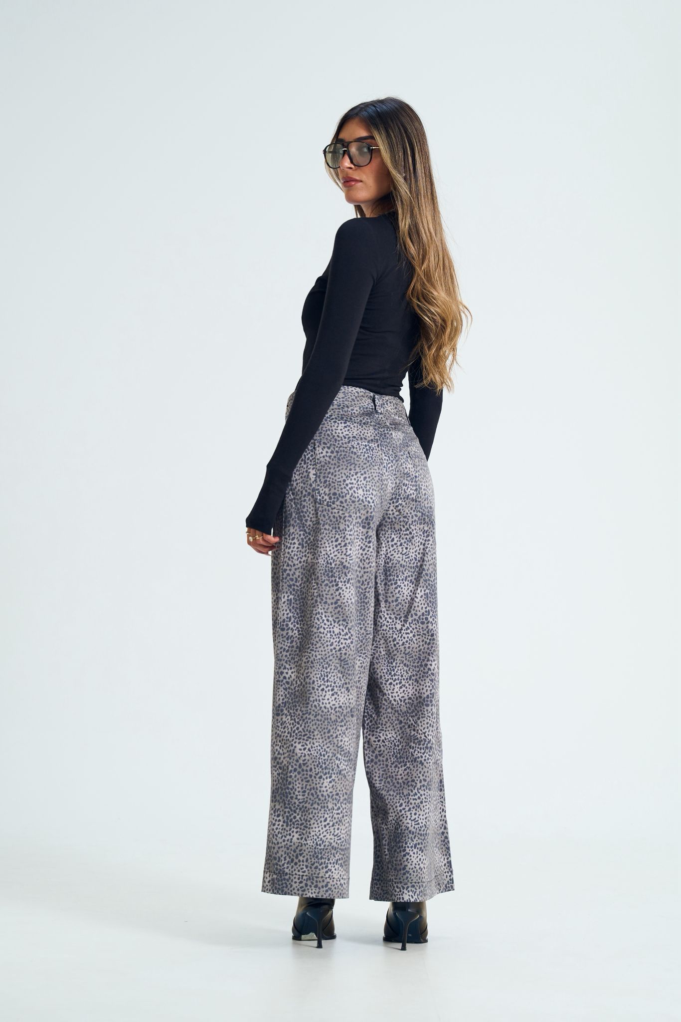 מכנס בהדפס מנומר מהמם, גוונים של אפור וירקרק בהיר.